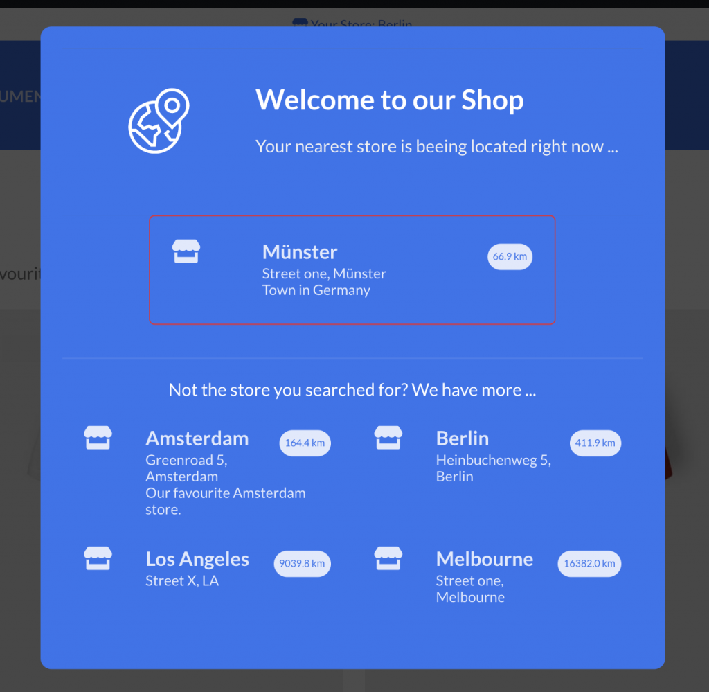 Optional können Sie Ihre Kunden die nächstgelegene Filiale zu ihrem aktuellen Standort selbst auswählen lassen. Unser Plugin schlägt automatisch das nächstgelegene Lager vor, zeigt aber auch weitere Möglichkeiten an, die zutreffen könnten.